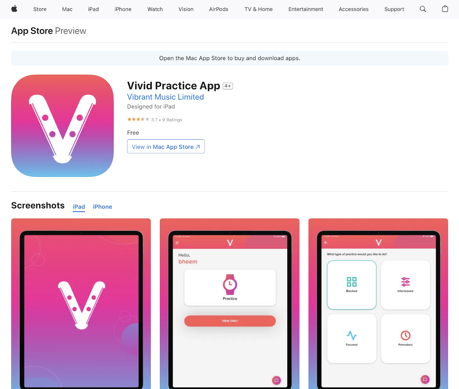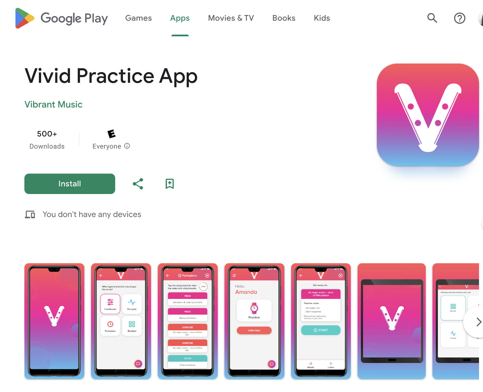 You can use these links to find the app in either the Apple App Store or the Google Play store. If the links aren’t working, search the store for “Vivid Practice App”.