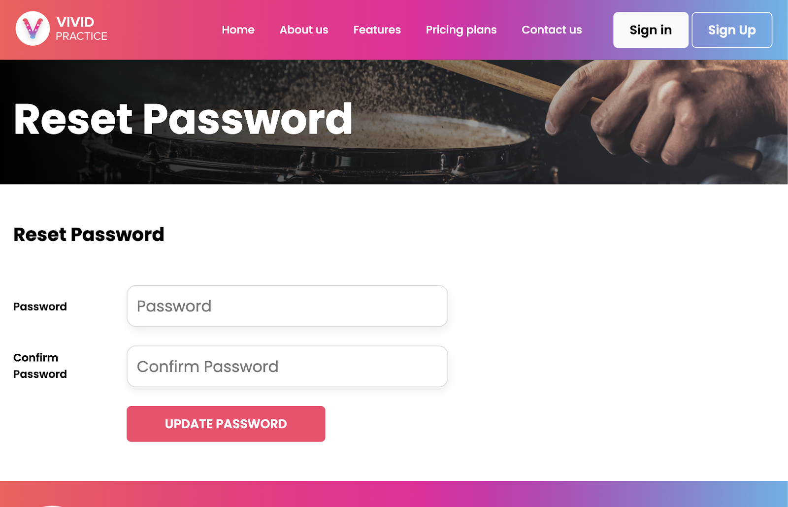 If you’ve forgotten your password, go to the Sign In screen and select the “Forgot password?” text. Enter the email address attached to your Vivid account. You should receive an email from support@vividpractice.com within a few minutes with a button to click to reset your password. That will take you to a unique-to-you password reset webpage that looks like this: