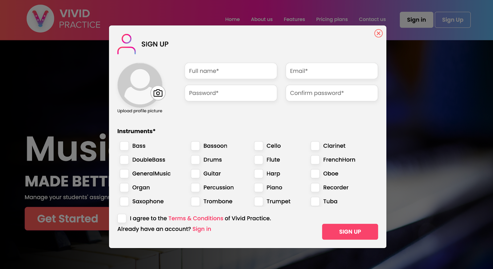 On the Vivid Practice website, select the “Sign Up” button. Enter your full name, email address, and a password. Then select the instruments you teach—scroll to see the whole list, or use the “other” option to add your own.