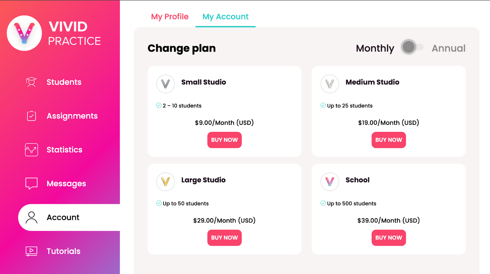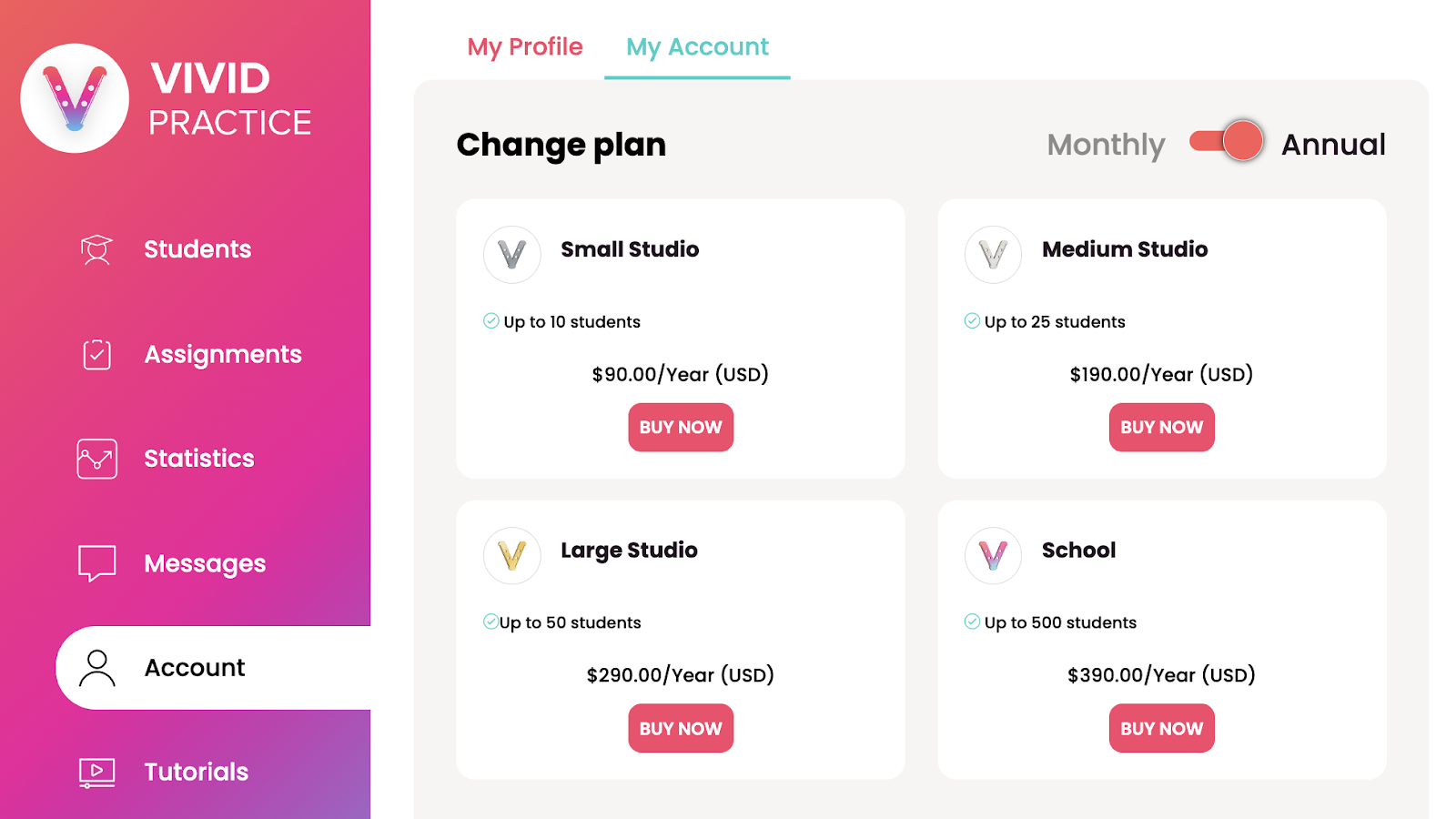 When you’re ready to use Vivid with more than one student, visit the “My Account” section and select the plan you’d like.