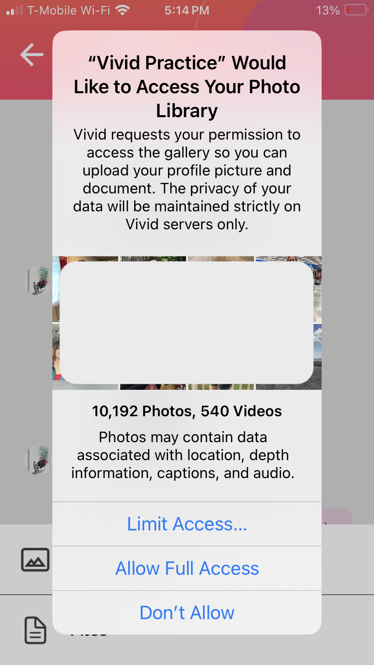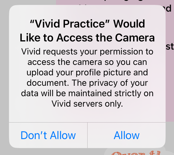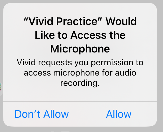 When you are sending a message inside Vivid, you can use your device’s camera and microphone to add audio and video to your text. However, Vivid Practice needs permission from your device. The first time you try recording or attaching media to a message, the app will prompt your device to request permission.